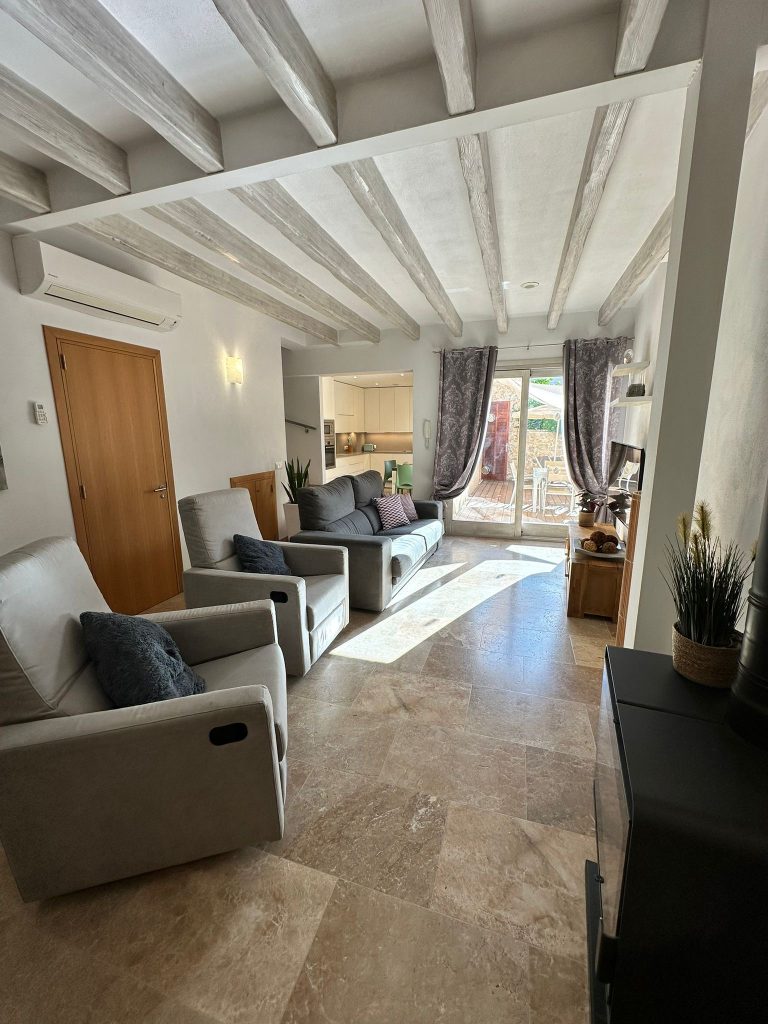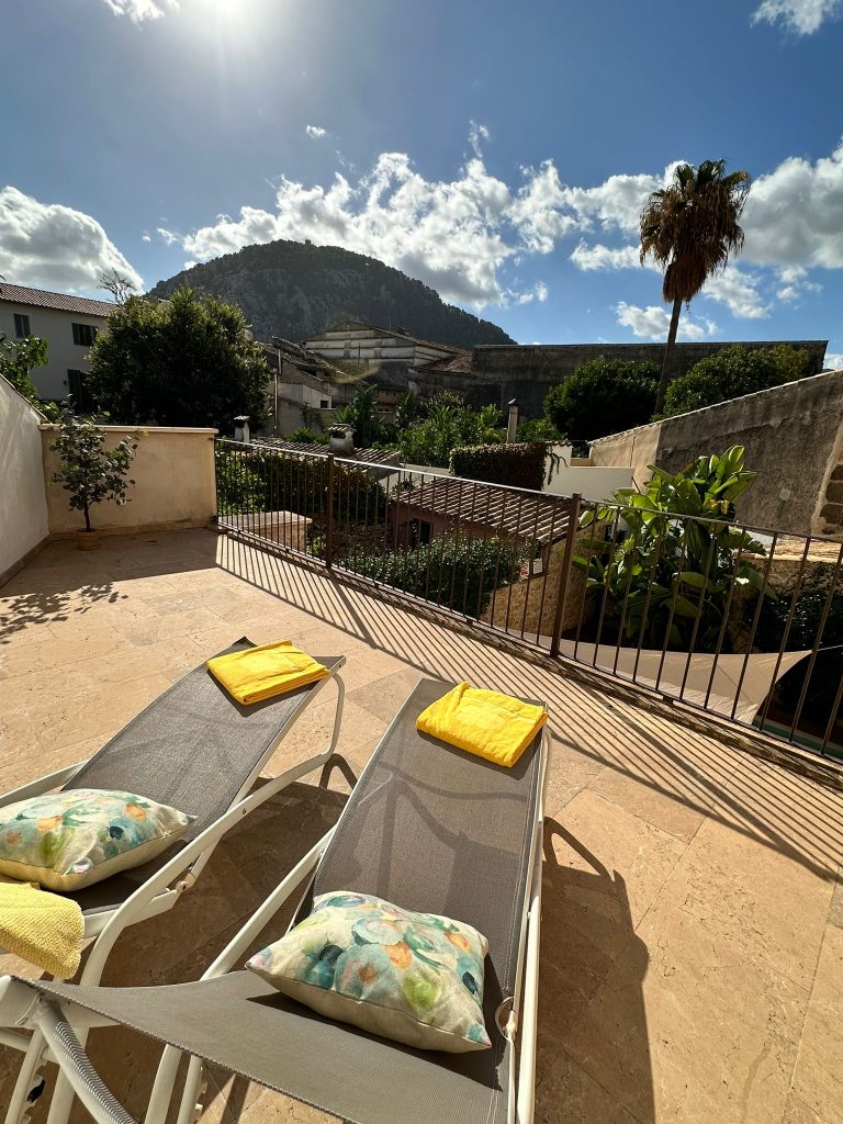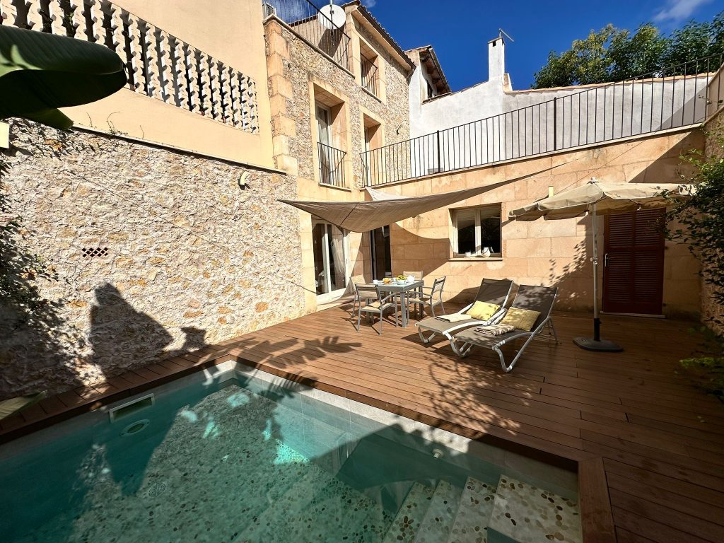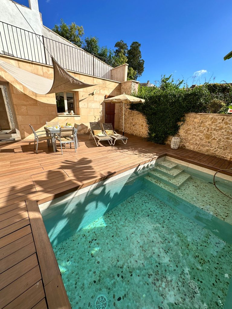 Wonderful luxury townhouse with private pool area to rent in Pollença, Mallorca. It is set in a very quiet street, but at the same time at a few minutes walk to the town center and its main streets. The lovely dining and living room is open to the modern and comfortable kitchen. The living room is also open to the beautiful terrace with private swimming pool, furnitured with a table and clairs to have lunch or dinner and sunloungers. There is also a bathroom downstairs. Upstairs there are two lovely decorated bedrooms and another bathroom. One of the bedrooms is open to a terrace that can be used as a solarium. A lovely place to relax and enjoy the island.