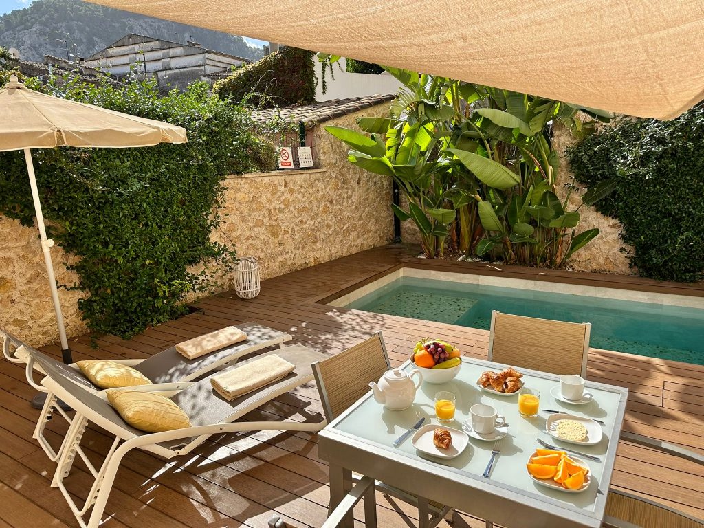 Maravillosa casa de pueblo de lujo con piscina privada situada en Pollença, en el norte de la isla de Mallorca. Está situado en una calle muy tranquila, pero al mismo tiempo a pocos minutos a pie del centro del pueblo y sus calles principales. El comedor y sala de estar está abierto a la cocina moderna y cómoda. El salón también está abierto a la hermosa terraza con piscina privada, amueblada con una mesa y sillas para almorzar o cenar y tumbonas. También hay un cuarto de baño abajo. Arriba hay dos habitaciones cuidadosamente decoradas y otro baño. Uno de los dormitorios está abierto a una terraza que se puede utilizar como un solarium. Un lugar encantador para relajarse y disfrutar de la isla.